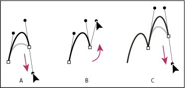 Drawing an S curve A.Starting to drag new smooth pointB.Dragging in same direction as previous direction line, creating an S curveC.Result after releasing mouse button