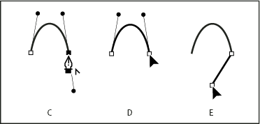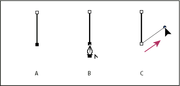 Drawing a straight segment followed by a curved segment (part 1) A. Straight segment completedB. Positioning Pen tool over endpoint (the Convert Point icon appears only in Illustrator and InDesign)C. Dragging direction point